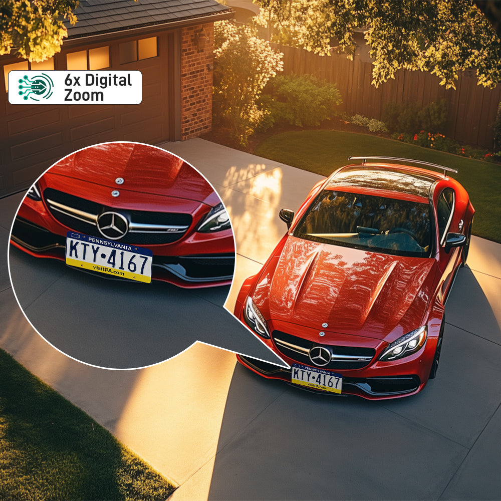 With 6x digital zoom, the optimal distance for reading a car license plate is approximately 16 to 23 feet (5 to 7 meters). For facial recognition, the effective range is around 33 to 43 feet (10 to 13 meters).