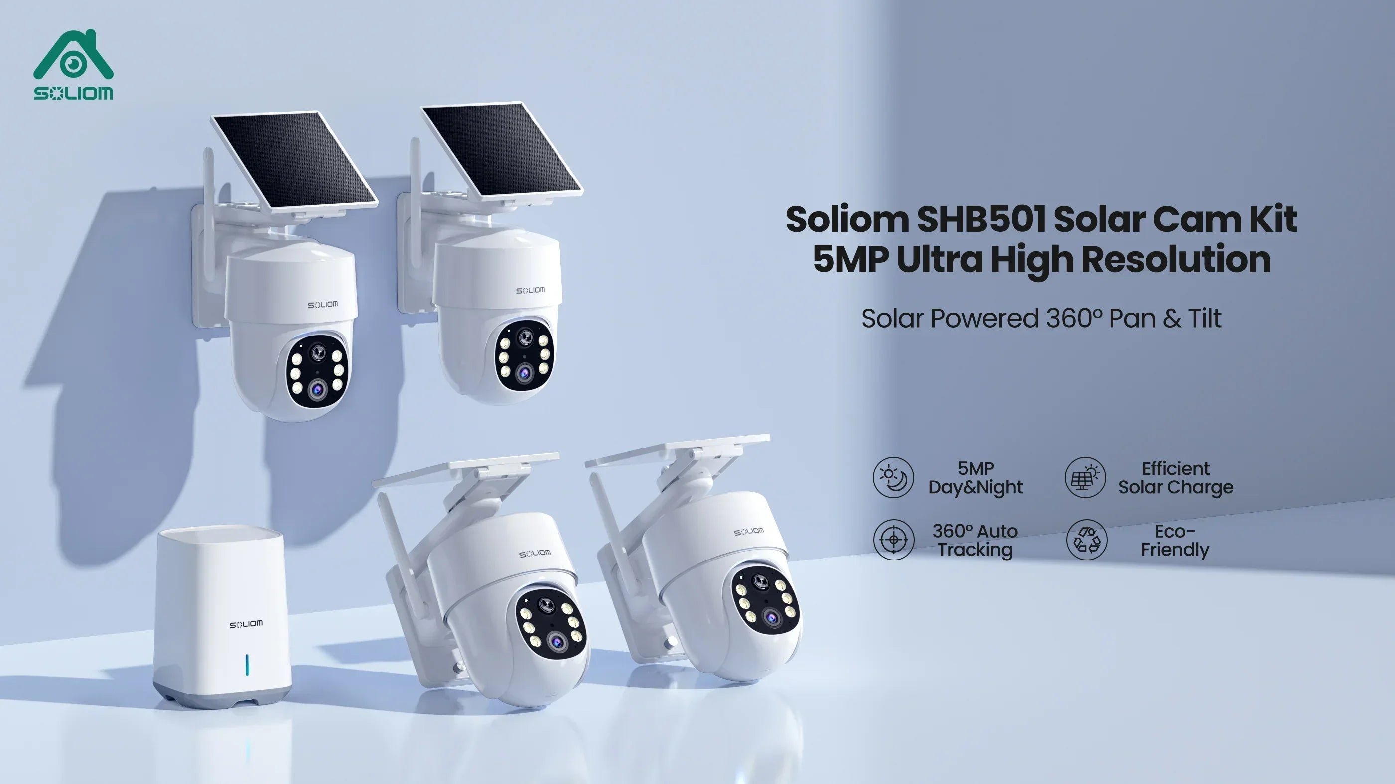 Soliom Wireless 5MP UHD Outdoor Solar Powered Security with Homebase, 3K Res, 360°PTZ, 2-Cam Pack, 4-Cam Pack, No Subscription