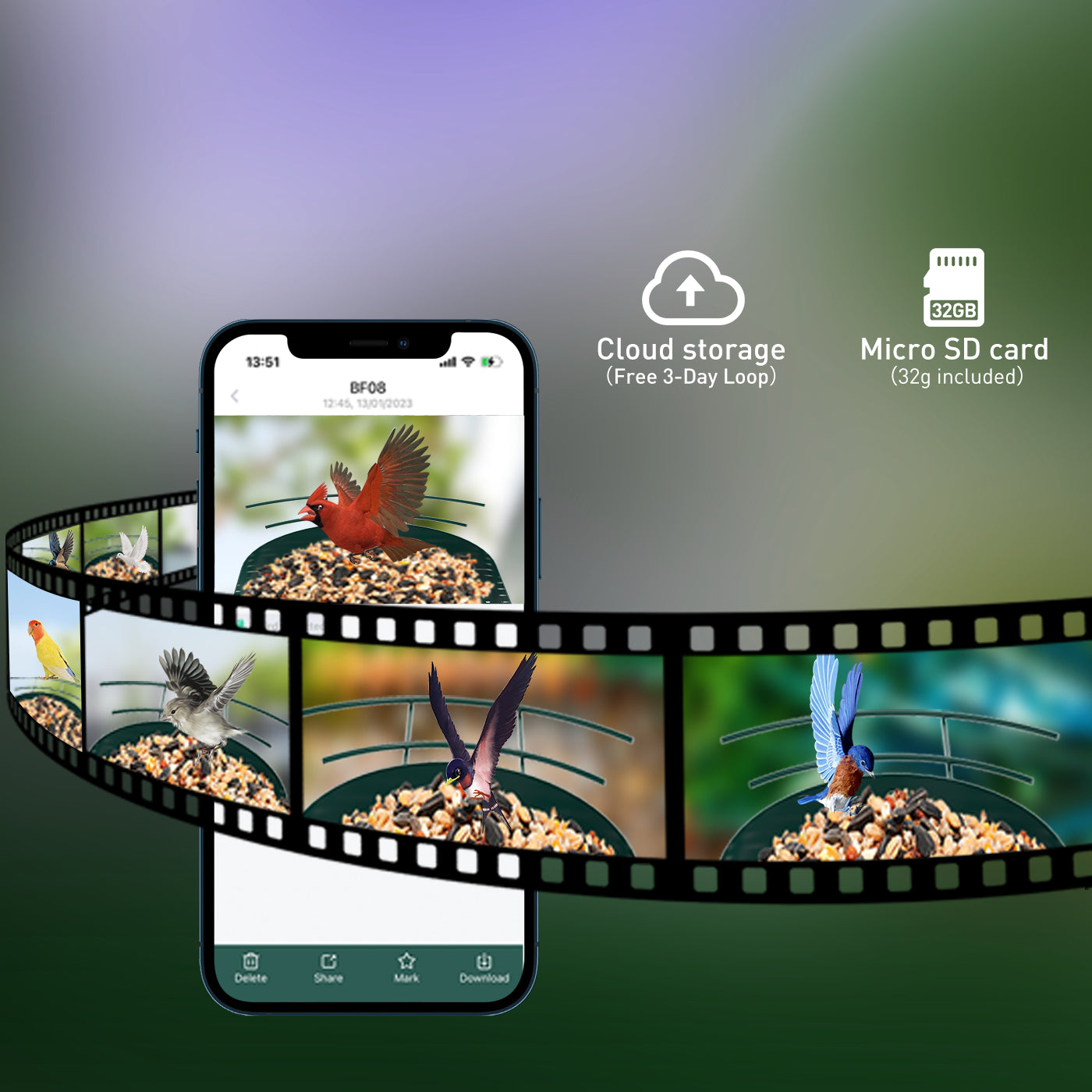 The Soliompro bird feeder with a camera will automatically record videos of the birds visiting your feeder and store them in the cloud for up to 3 days. You can keep older videos by subscribing to cloud storage or using the free 32GB memory card that comes with it.