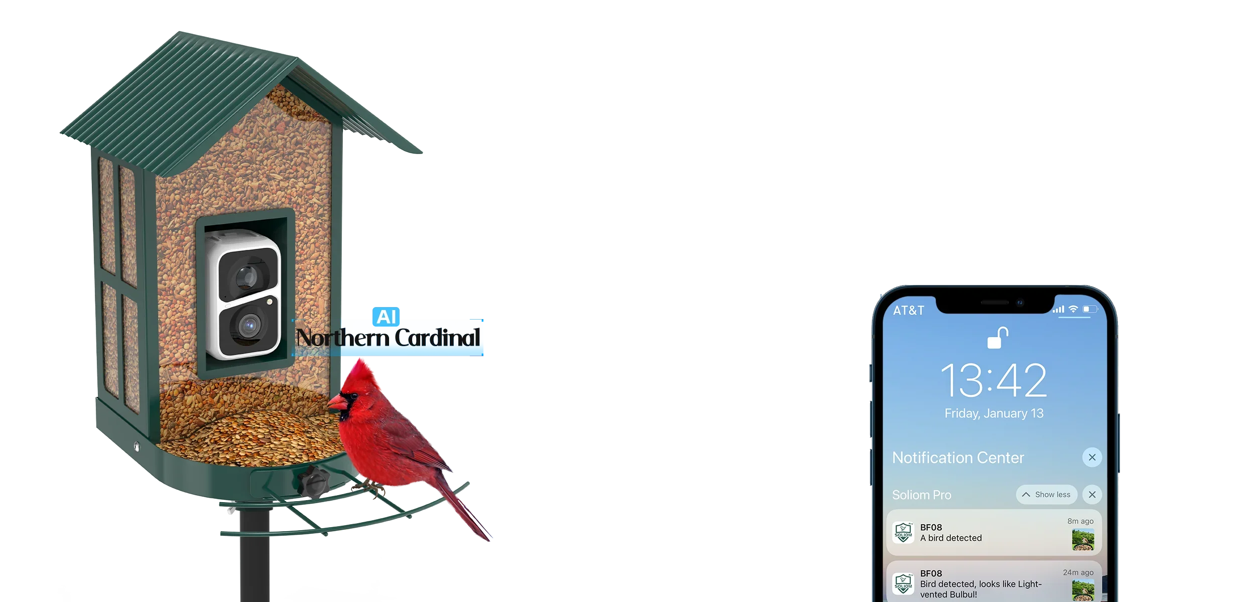 The Soliompro BF08s bird feeder camera automatically captures stunning videos of every feathered visitor. Get instant alerts with a clear snapshot image on your phone (Soliom Pro app) and watch your favorite birds come to life right before your eyes.
