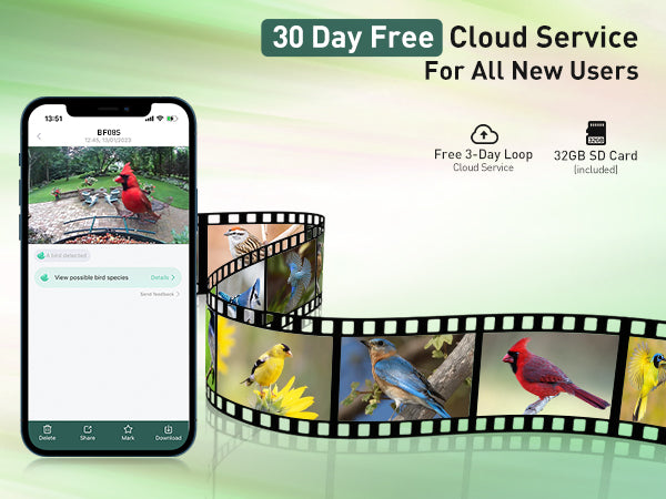 The Soliompro bird feeder with a camera will automatically record videos of the birds visiting your feeder and store them in the cloud for up to 3 days. You can keep older videos by subscribing to cloud storage or using the free 32GB memory card that comes with it.