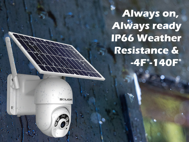 With IP66 weatherproof resistancelevel, Soliom S800C-4G can prevent water from seeping into the security camera and is suitable for the temperature range from-4F° to 140F°, which is able to withstand tough weather like wind, rain, and snow. The Soliom4G cellular security camerais always on and always ready.